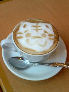 写真はメイドカフェで親父がたのんだカプチーノです。